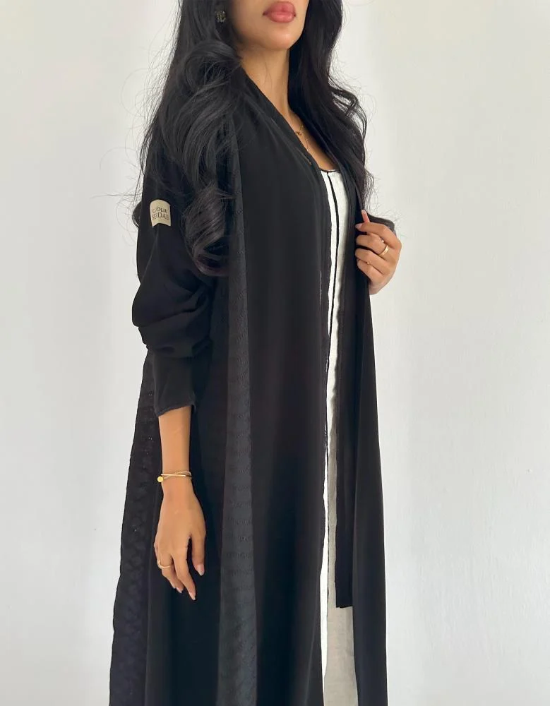 اجمعي بين النعومة الملكية واللمسة الطبيعية في إطلالتك مع عباية كريب ملكي سوداء بتفاصيل جوانب من اللنن الهندي. تصميم كلوش أنيق يمنحك انسيابية مريحة، بينما تضيف خامة اللنن الجانبية لمسة فريدة من الخفة والتميز. هذه العباية الصيفية صممت لتلائم ذوقك الرفيع وإطلالتك اليومية أو الرسمية