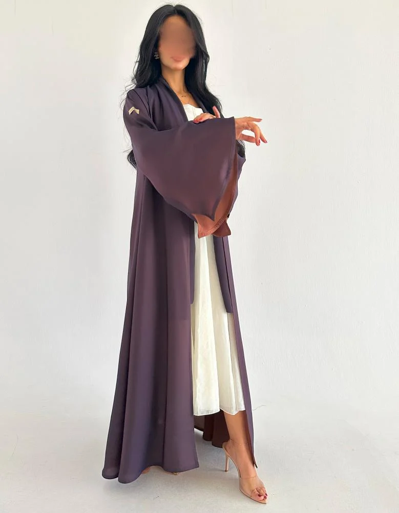 عباية عملية بلمسة أنثوية ناعمة، بلون توفيس موف الهادئ، وقصة كلوش بالكامل تضيف لك راحة وأناقة في نفس الوقت. مصممة خصيصاً لمشاويرك اليومية بأسلوب بسيط وراقي، مع أكمام كلوش واسعة تزيد من انسيابية الحركة وتكمل الإطلالة العملية الناعمة