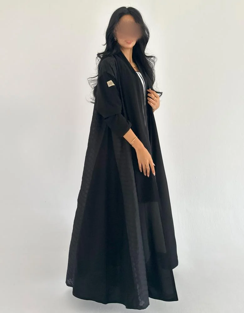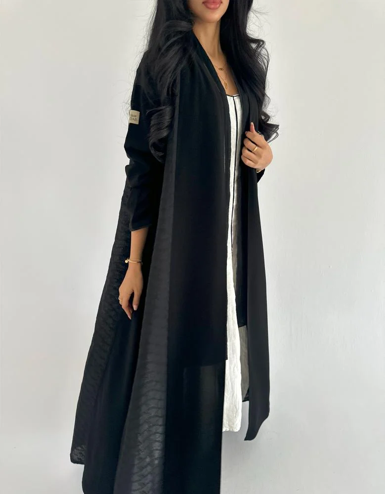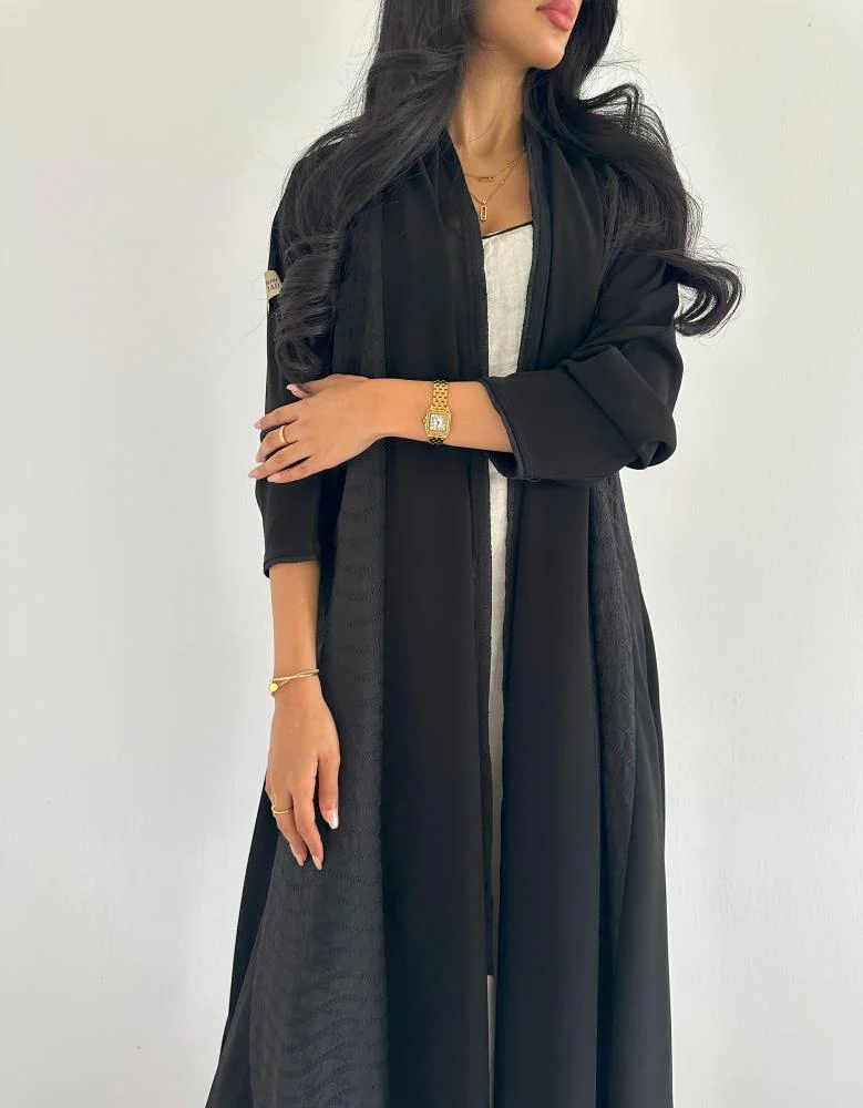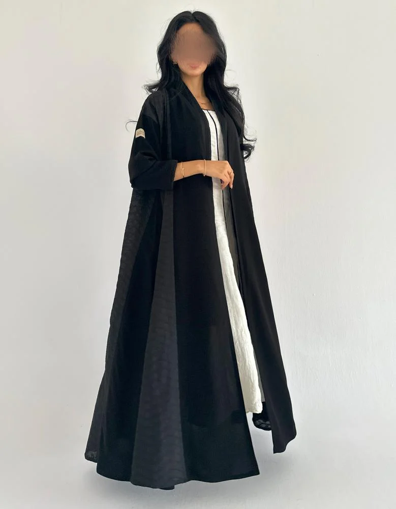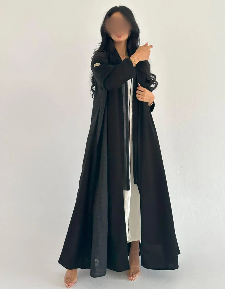 اجمعي بين النعومة الملكية واللمسة الطبيعية في إطلالتك مع عباية كريب ملكي سوداء بتفاصيل جوانب من اللنن الهندي. تصميم كلوش أنيق يمنحك انسيابية مريحة، بينما تضيف خامة اللنن الجانبية لمسة فريدة من الخفة والتميز. هذه العباية الصيفية صممت لتلائم ذوقك الرفيع وإطلالتك اليومية أو الرسمية