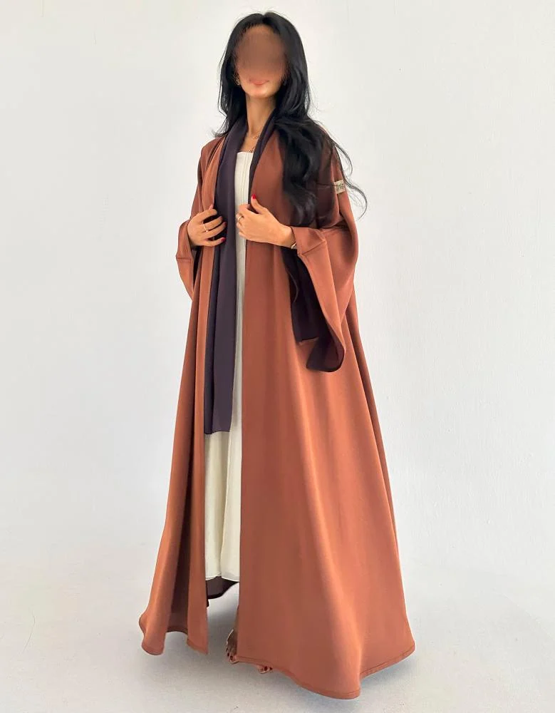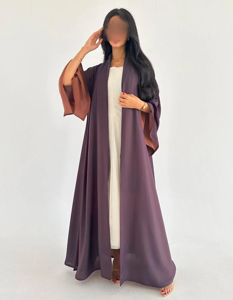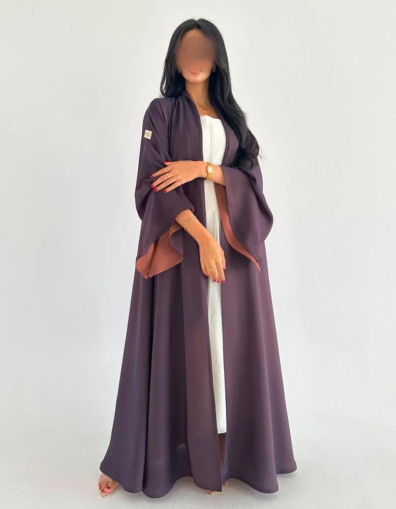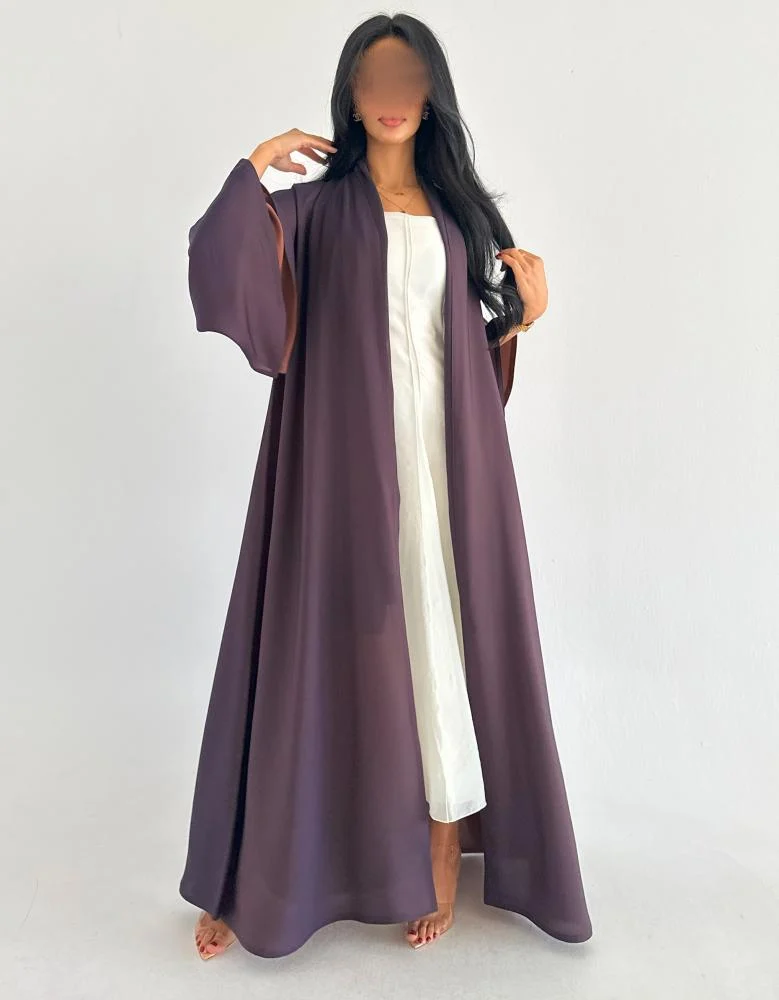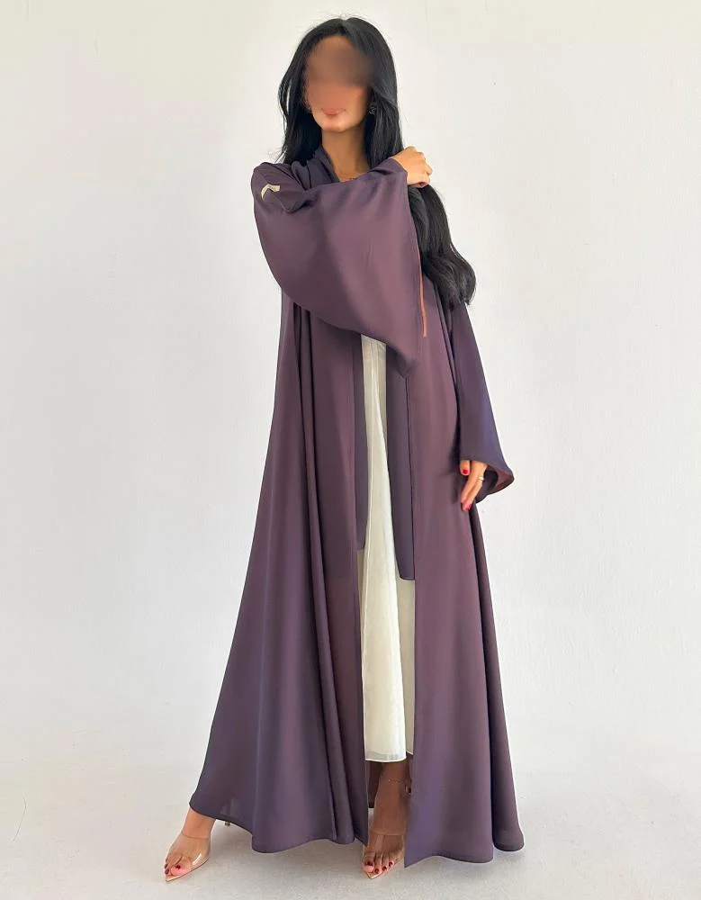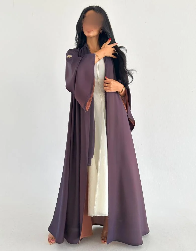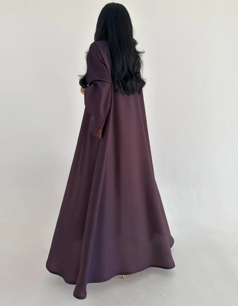 عباية عملية بلمسة أنثوية ناعمة، بلون توفيس موف الهادئ، وقصة كلوش بالكامل تضيف لك راحة وأناقة في نفس الوقت. مصممة خصيصاً لمشاويرك اليومية بأسلوب بسيط وراقي، مع أكمام كلوش واسعة تزيد من انسيابية الحركة وتكمل الإطلالة العملية الناعمة